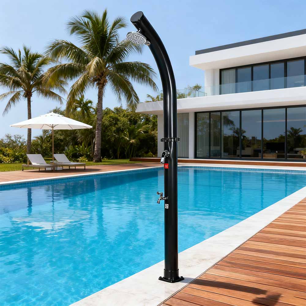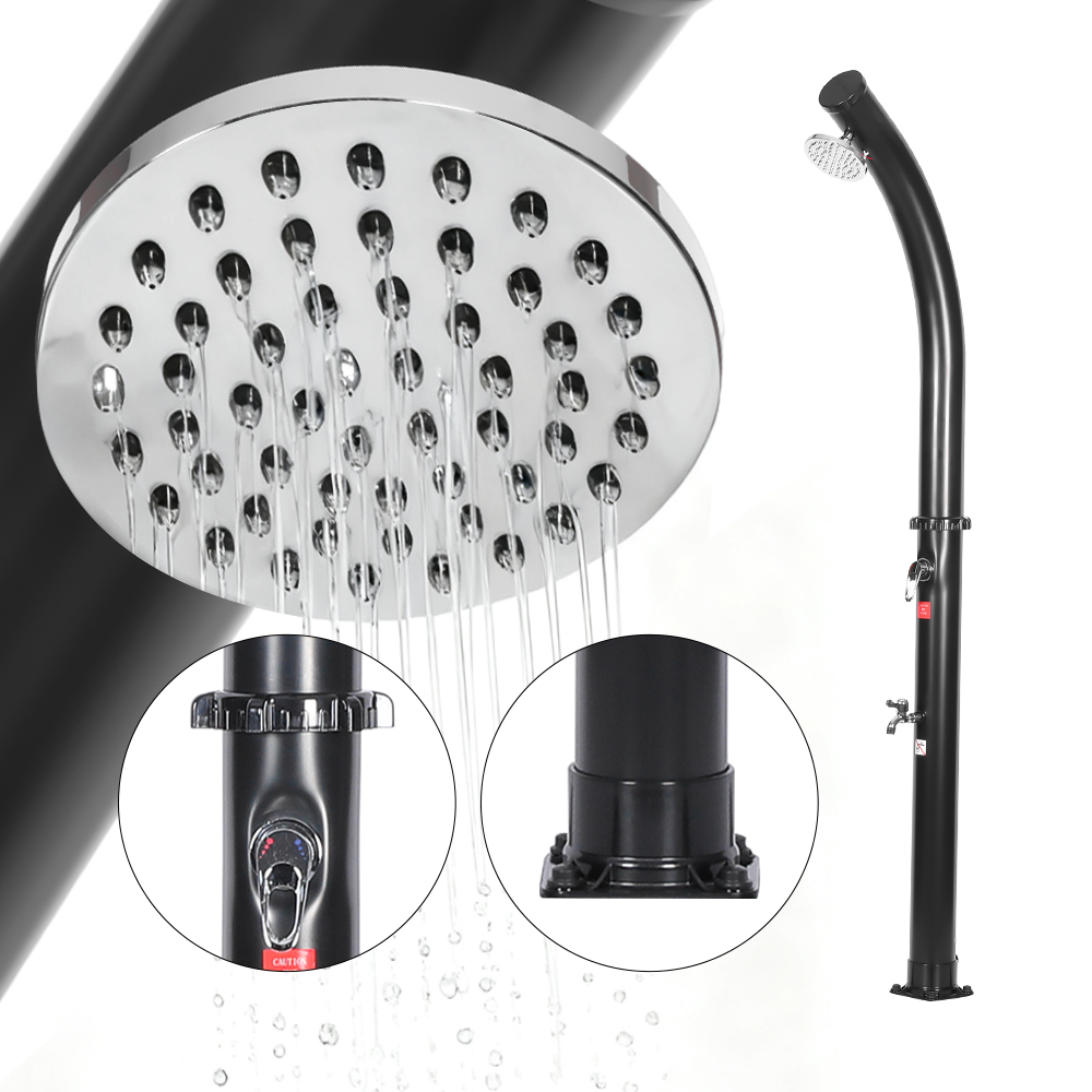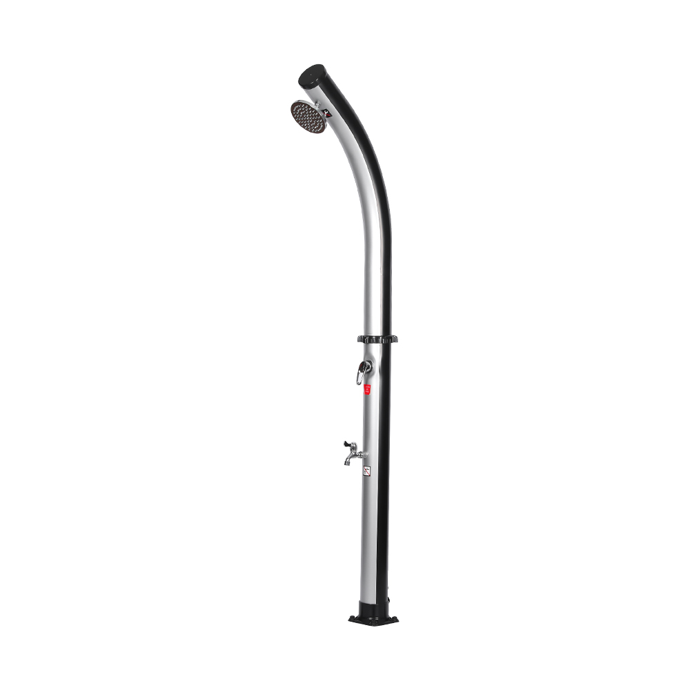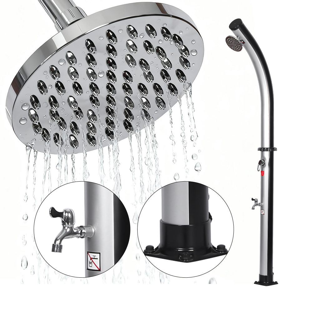 After filling the shower pipe via a garden hose, the water naturally warms up in the sun, and the integrated fitting allows for easy adjustment to your preferred temperature. Designed for versatility, this LY18L02 18L free-standing bend body outdoor solar pool shower with shower head is perfect for beachside outings, poolside relaxation, or countryside getaways, making it an excellent choice for hotels, holiday homes, and bungalows to provide refreshing comfort anywhere. It is also equipped with a convenient hose connection for effortless filling and a drain plug for quick emptying, ensuring safe and easy preparation for winter storage.