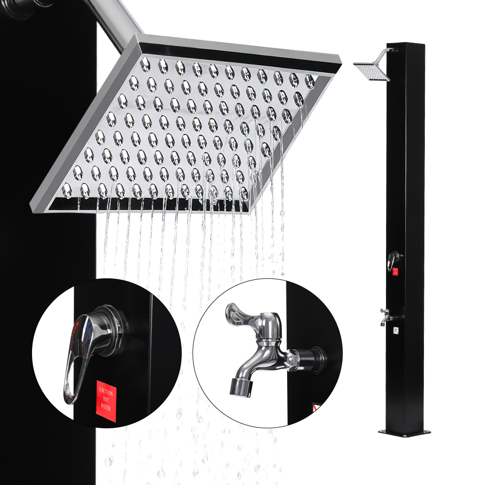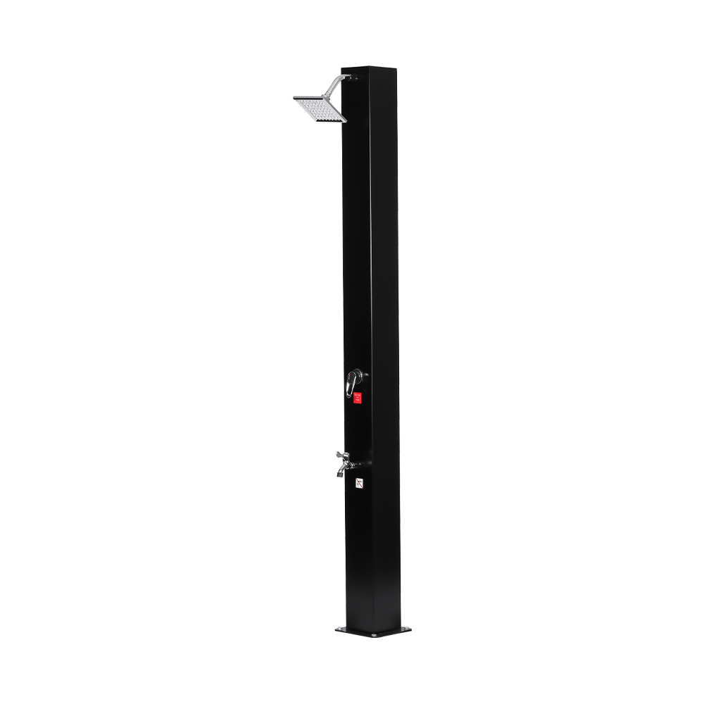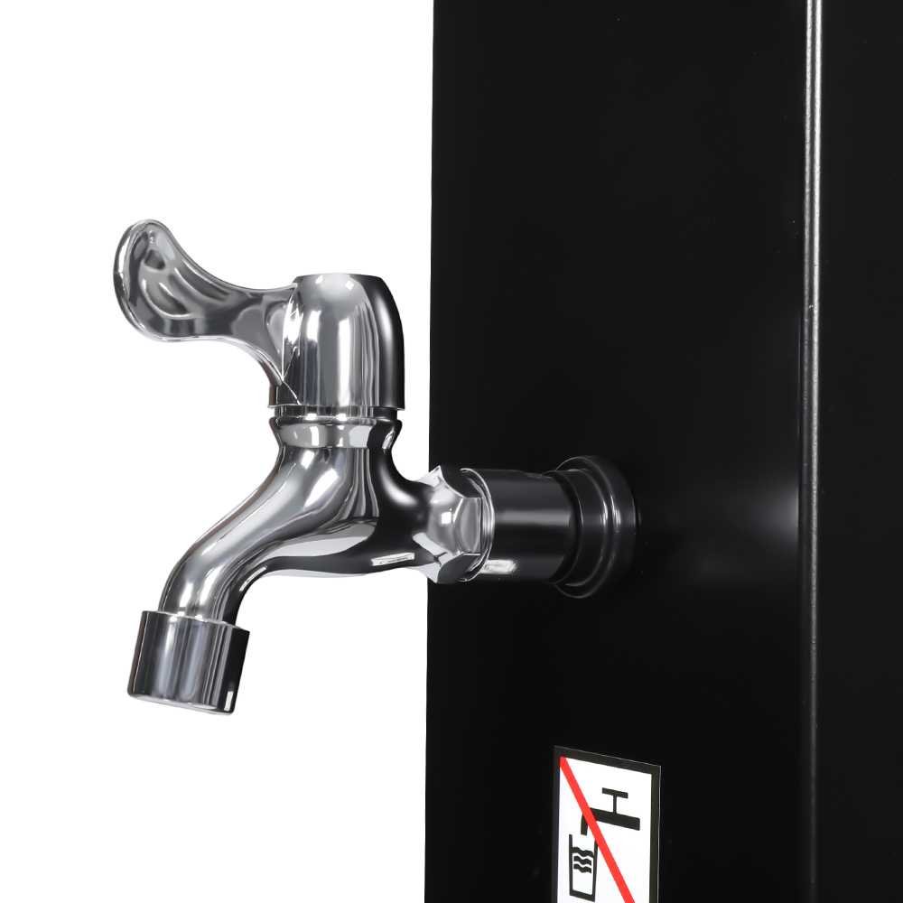 This LY35L04-SS high-capacity outdoor solar shower is designed to provide a comfortable and convenient outdoor bathing experience by harnessing the power of sunlight to heat water up to approximately 60 °C, eliminating the need for electricity. Filling the shower pipe is effortless—simply connect a standard garden hose, and the shower is ready for use. For added convenience, a built-in metal rack keeps shower essentials such as gel or shampoo within easy reach, while a thoughtfully placed drain hole at the bottom ensures quick and efficient water removal, preventing standing water. The entire unit is assembled by securely screwing the parts together, ensuring a stable structure, and for safe operation in outdoor environments, proper ground anchoring is required. To make installation and use straightforward, comprehensive multilingual instructions are included, making it accessible for users in various regions.