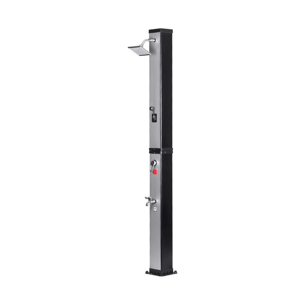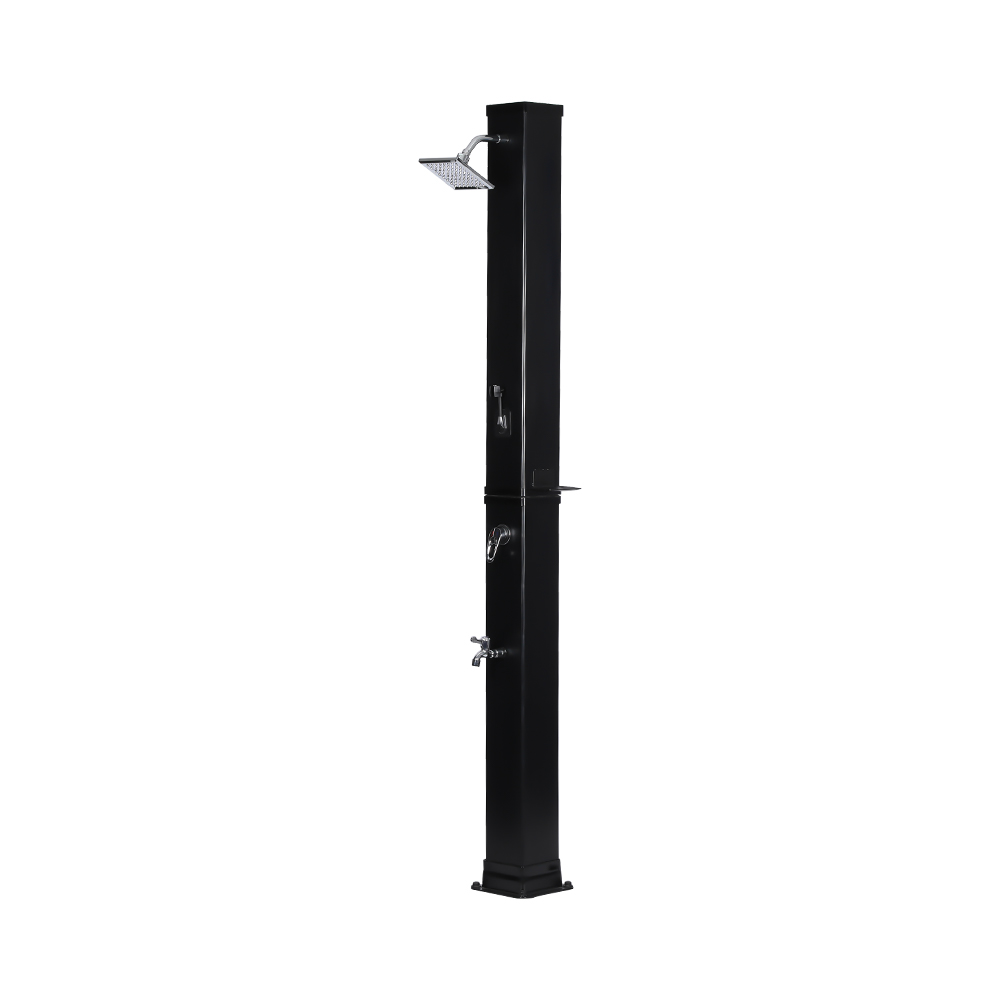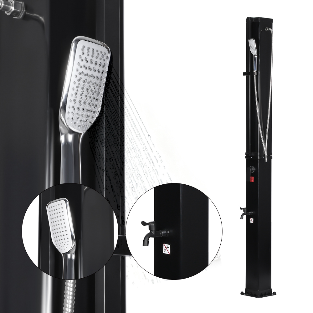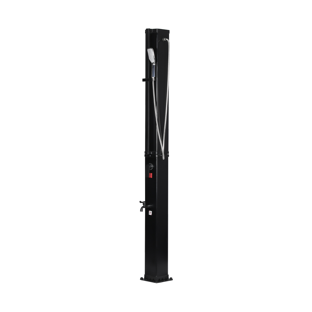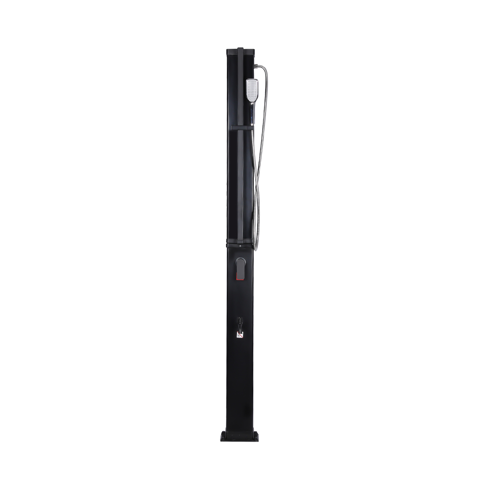This LY35L07 multifunctional large-capacity solar shower uses only sunlight to heat water up to 60 °C, providing an energy-saving and environmentally friendly way to enjoy outdoor bathing. Filling it is simple—just connect a standard garden hose to the inlet, and the shower pipe quickly gets ready for use. A built-in metal shelf offers a convenient spot for storing shower gel and other essentials, while drainage holes at the base ensure that water flows away efficiently, keeping the area dry and tidy. Designed with versatility in mind, this solar shower is perfect for various settings, whether at the beach, by the pool, in a holiday home, hotel, or bungalow. Its flexible structure allows it to adapt to different environments.