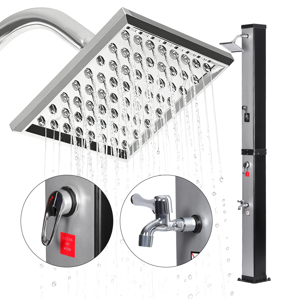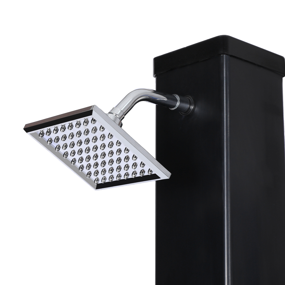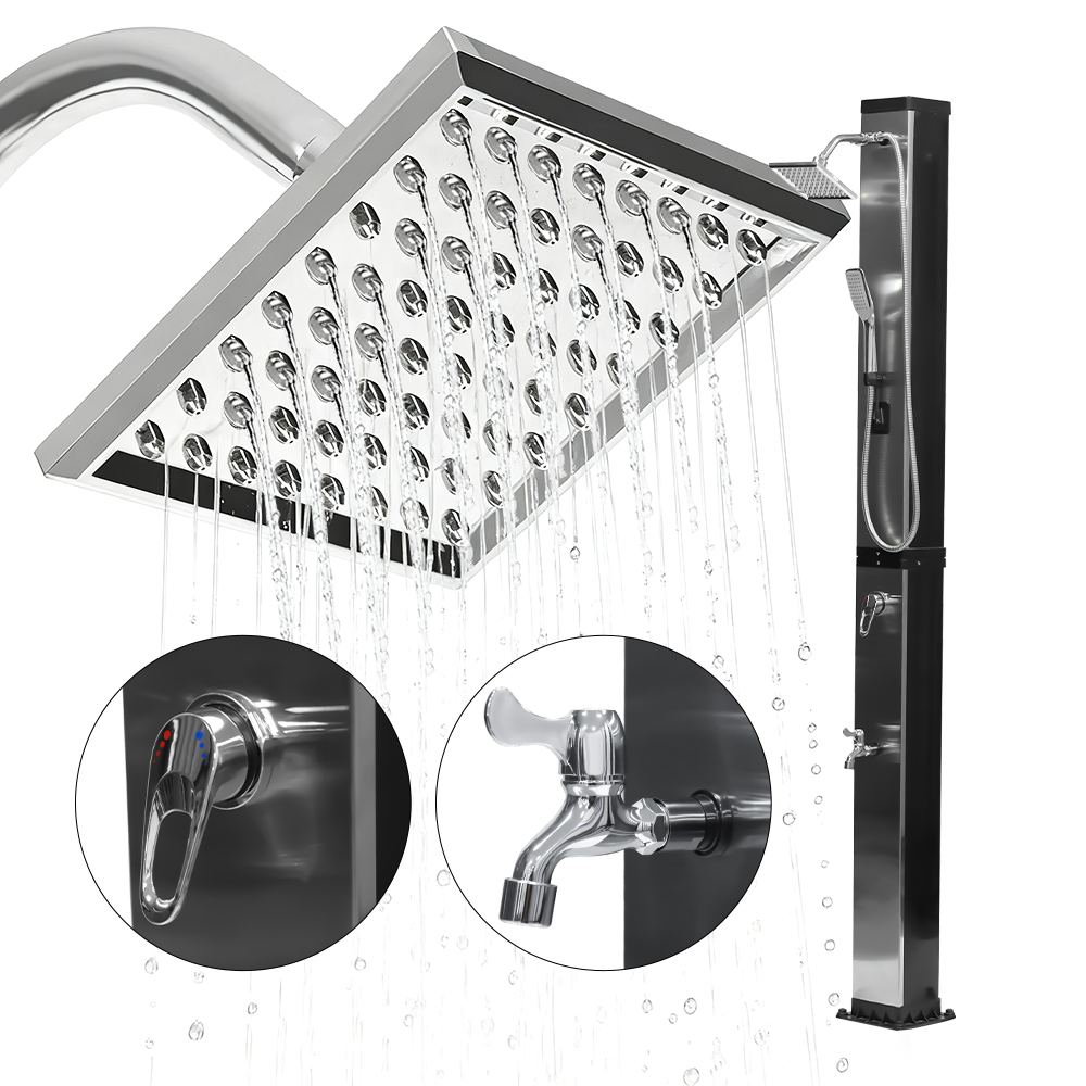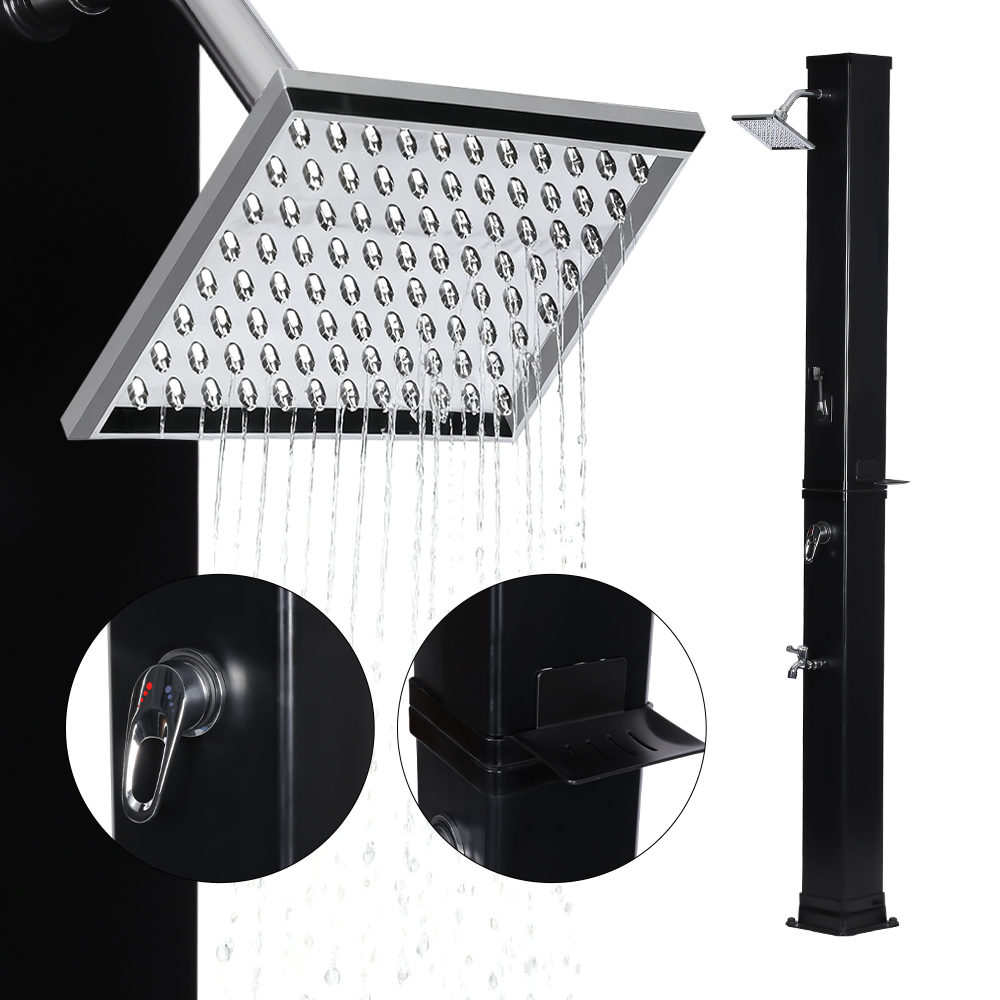 This LY35L07 multifunctional large-capacity solar shower uses only sunlight to heat water up to 60 °C, providing an energy-saving and environmentally friendly way to enjoy outdoor bathing. Filling it is simple—just connect a standard garden hose to the inlet, and the shower pipe quickly gets ready for use. A built-in metal shelf offers a convenient spot for storing shower gel and other essentials, while drainage holes at the base ensure that water flows away efficiently, keeping the area dry and tidy. Designed with versatility in mind, this solar shower is perfect for various settings, whether at the beach, by the pool, in a holiday home, hotel, or bungalow. Its flexible structure allows it to adapt to different environments.