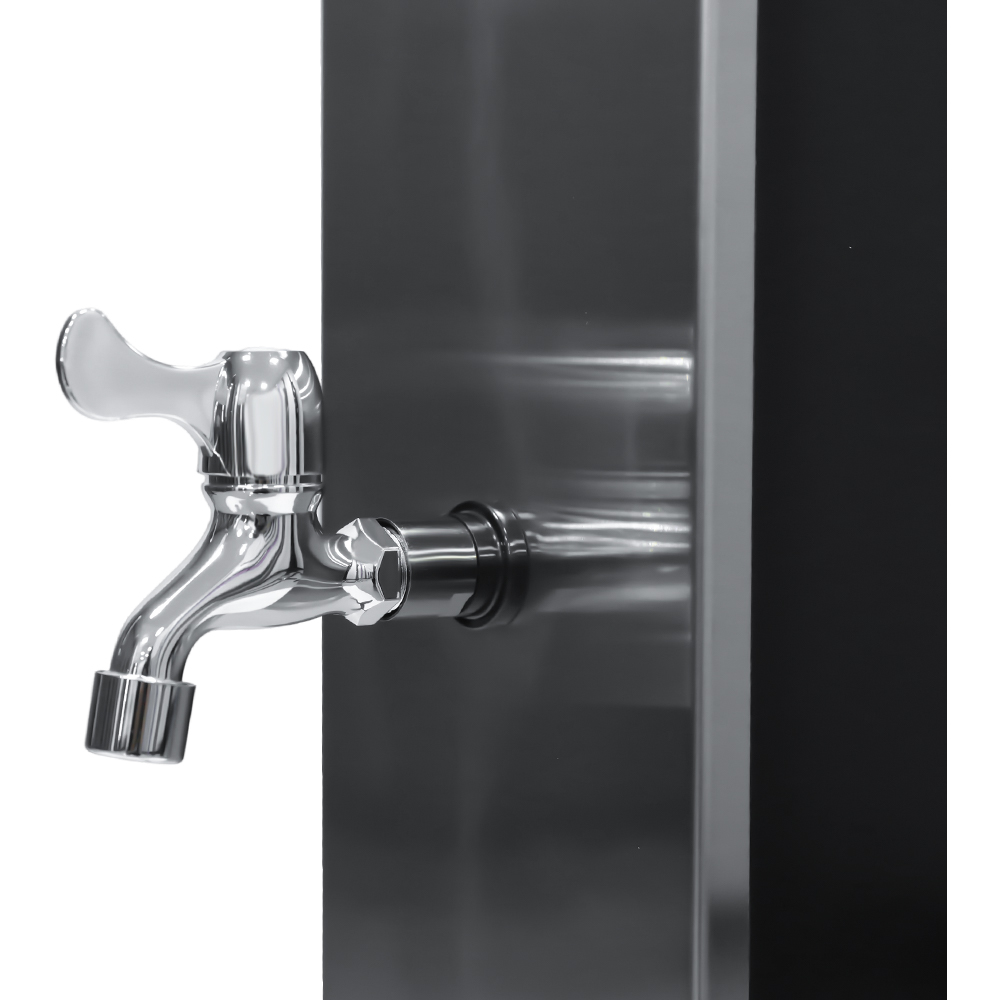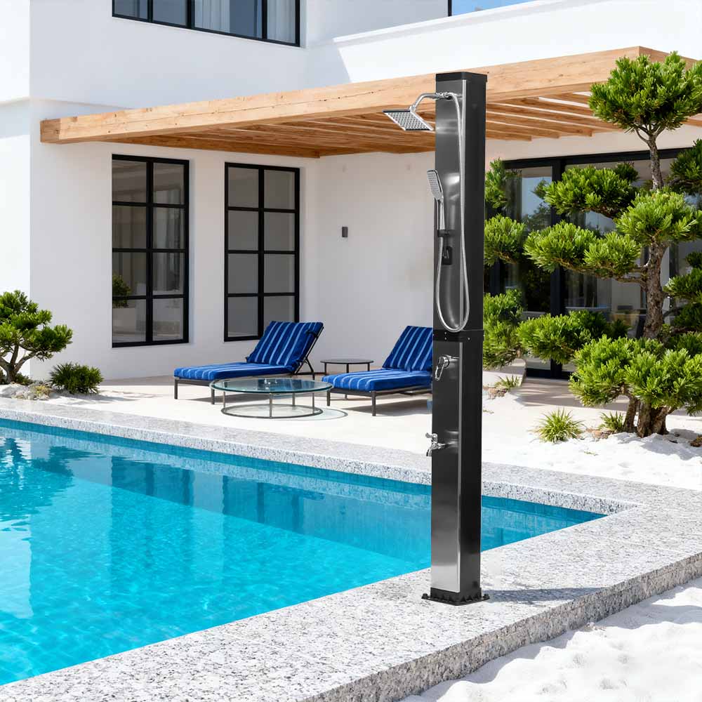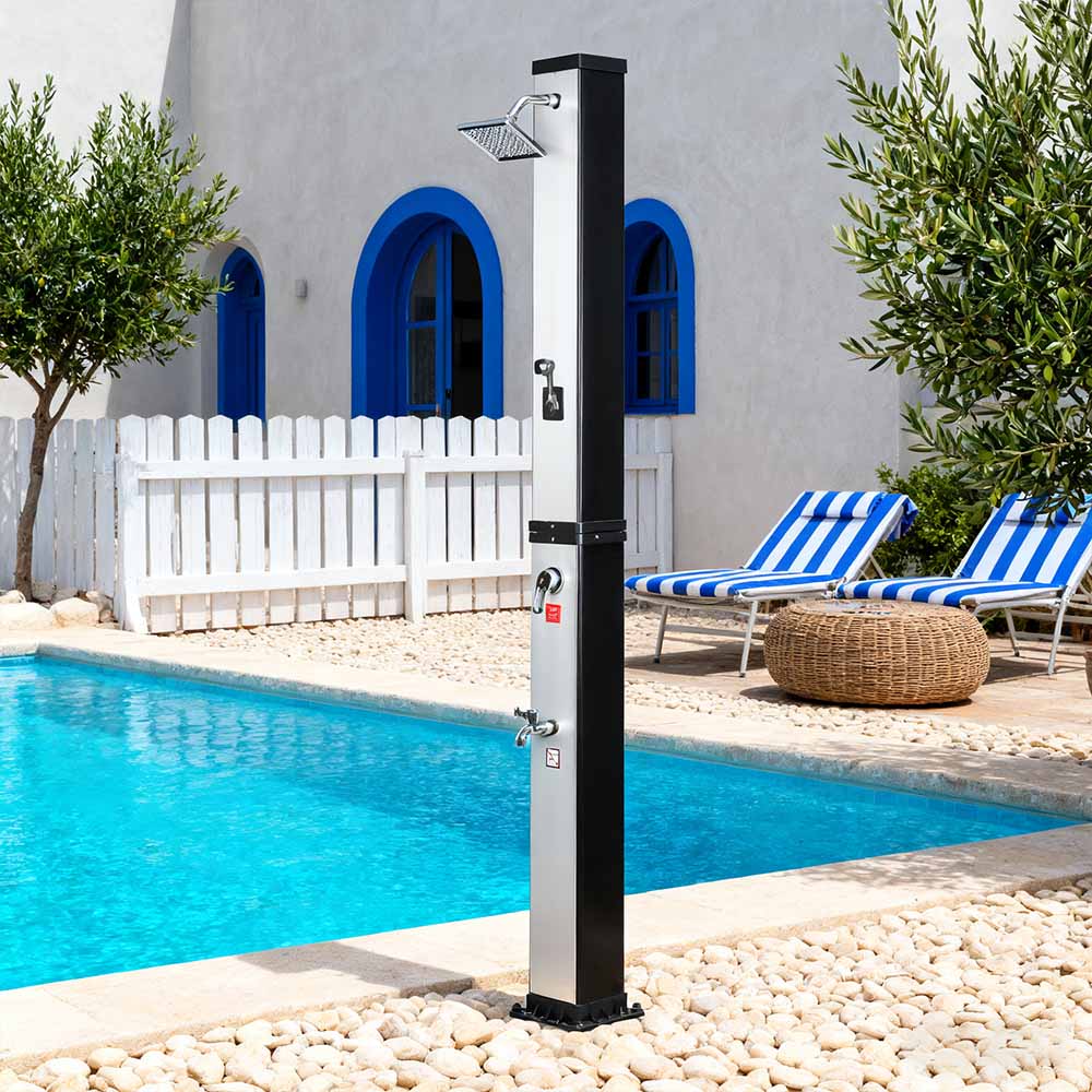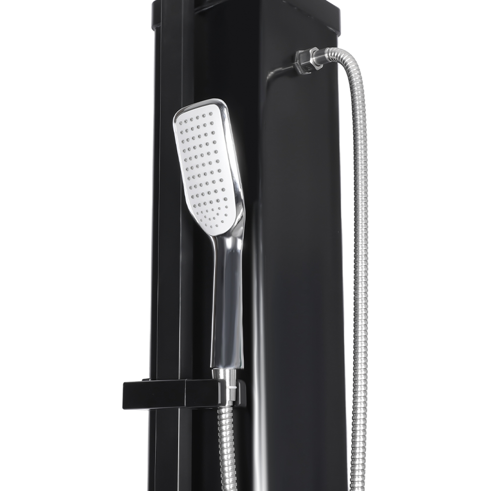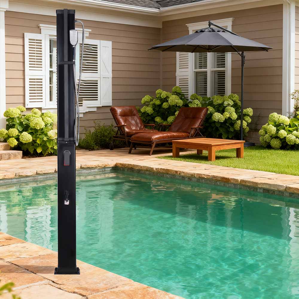 This LY35L07 multifunctional large-capacity solar shower uses only sunlight to heat water up to 60 °C, providing an energy-saving and environmentally friendly way to enjoy outdoor bathing. Filling it is simple—just connect a standard garden hose to the inlet, and the shower pipe quickly gets ready for use. A built-in metal shelf offers a convenient spot for storing shower gel and other essentials, while drainage holes at the base ensure that water flows away efficiently, keeping the area dry and tidy. Designed with versatility in mind, this solar shower is perfect for various settings, whether at the beach, by the pool, in a holiday home, hotel, or bungalow. Its flexible structure allows it to adapt to different environments.