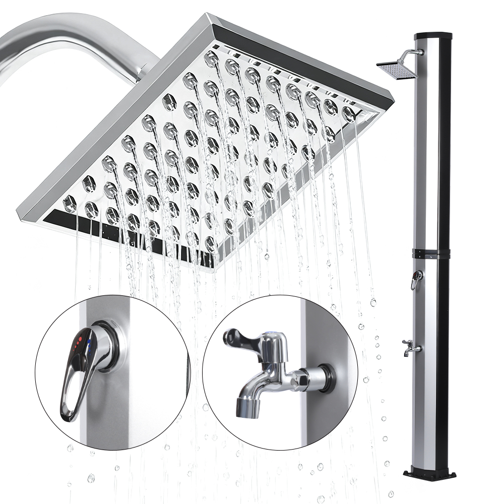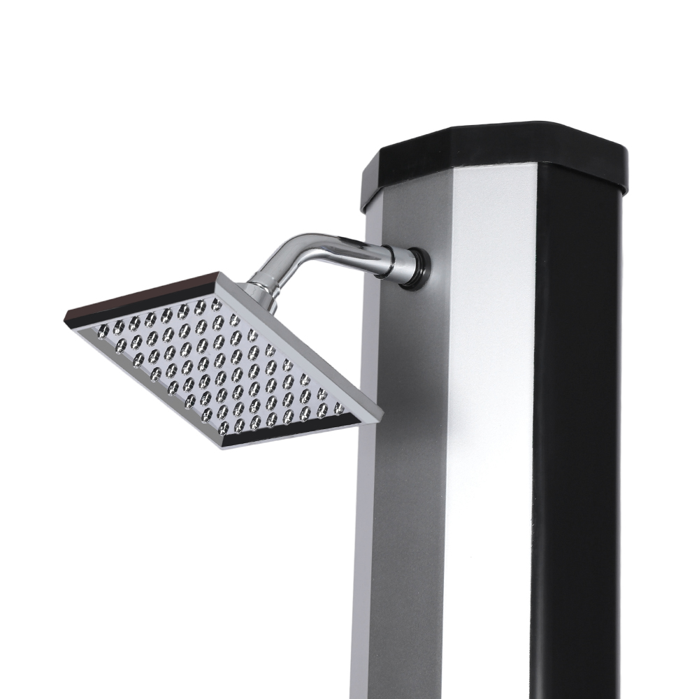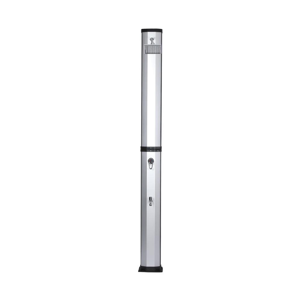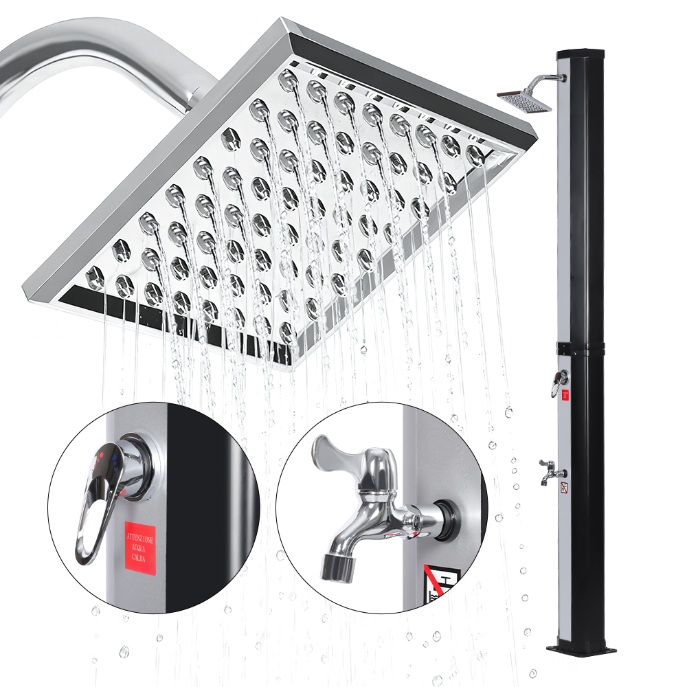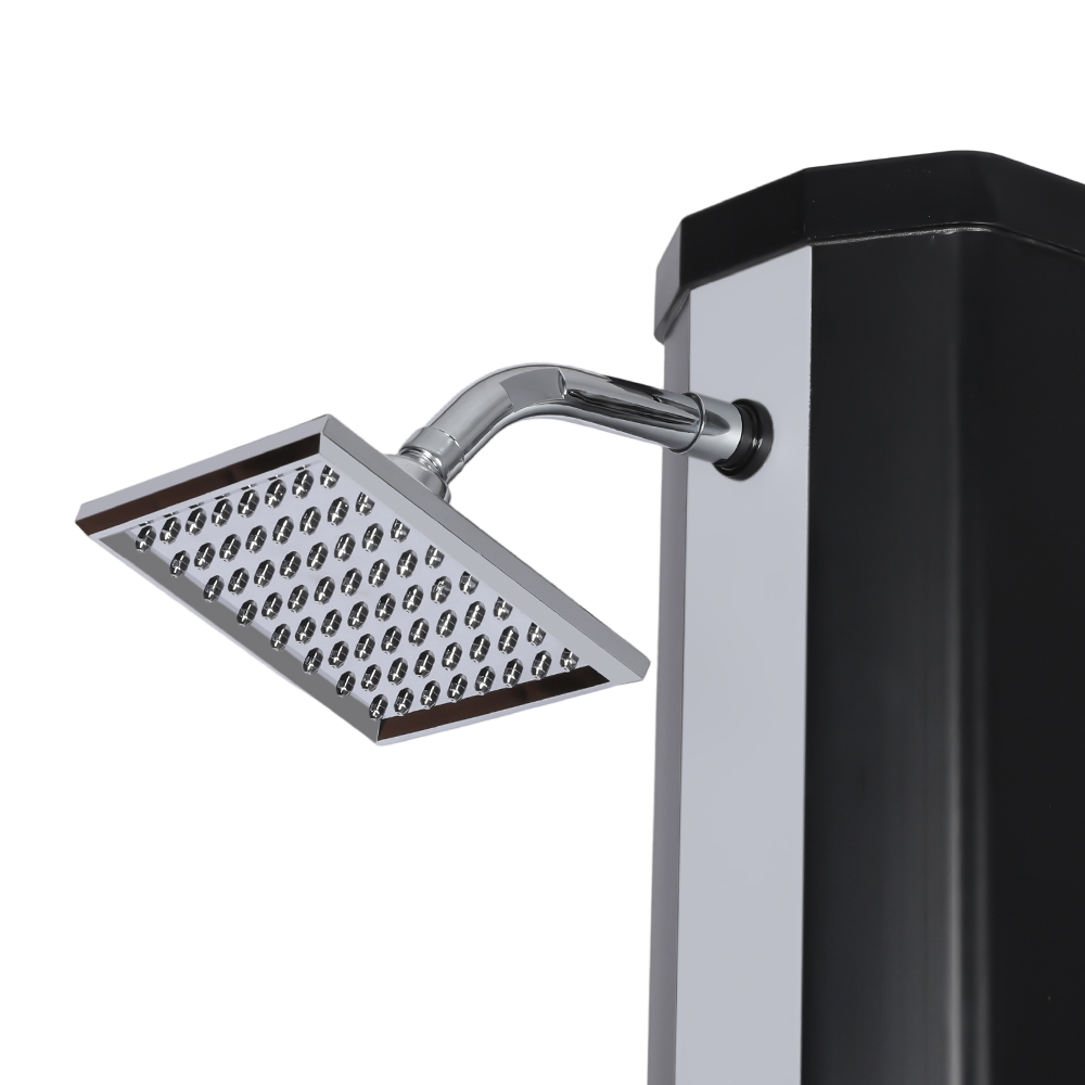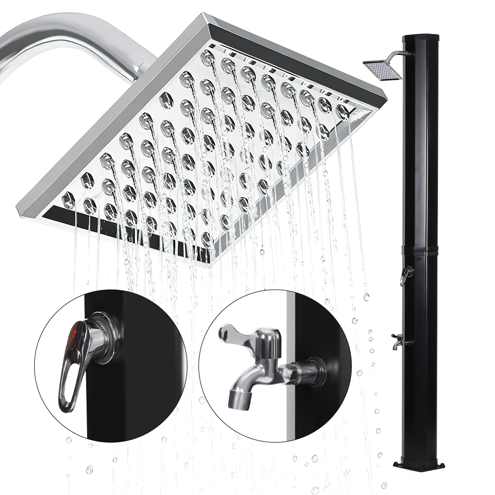 This LY35L08 flexible and simple solar shower is designed for both versatility and practicality. Its wide rain showerhead not only swivels 360° for a comprehensive cooling effect, but also allows for flexible adjustment of the water flow to suit your preferences, creating a relaxing shower experience similar to that of a natural waterfall. Installation is simple, and the convenient foot-operated faucet allows for easy spot rinsing for added refreshment when a full-body shower isn't required. Furthermore, the shower unit features a standard garden hose connection for quick and easy filling, and a drain plug allows for easy emptying of the shower pipe before winter, ensuring safety and reliability when not in use and extending its lifespan.